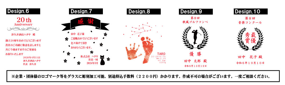 【Desing6】・・・盾用デザイン、【Desing7〜8】・・・写真立て用デザイン、【Desing9〜10】・・・トロフィー用デザイン